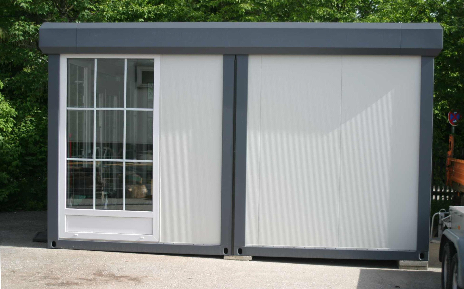 Containeranlage mit sekundärer Fassade. Außenfarbe: